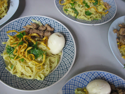 This is what I ate for lunch at the school one day last week. Looks good huh? It was! Now I suppose you want a name. I would call it khao soy-esque. Khao soy is a popular dish in Northern Thailand and this is very similar to it. You add some “soup” (broth) and that’s lunch!