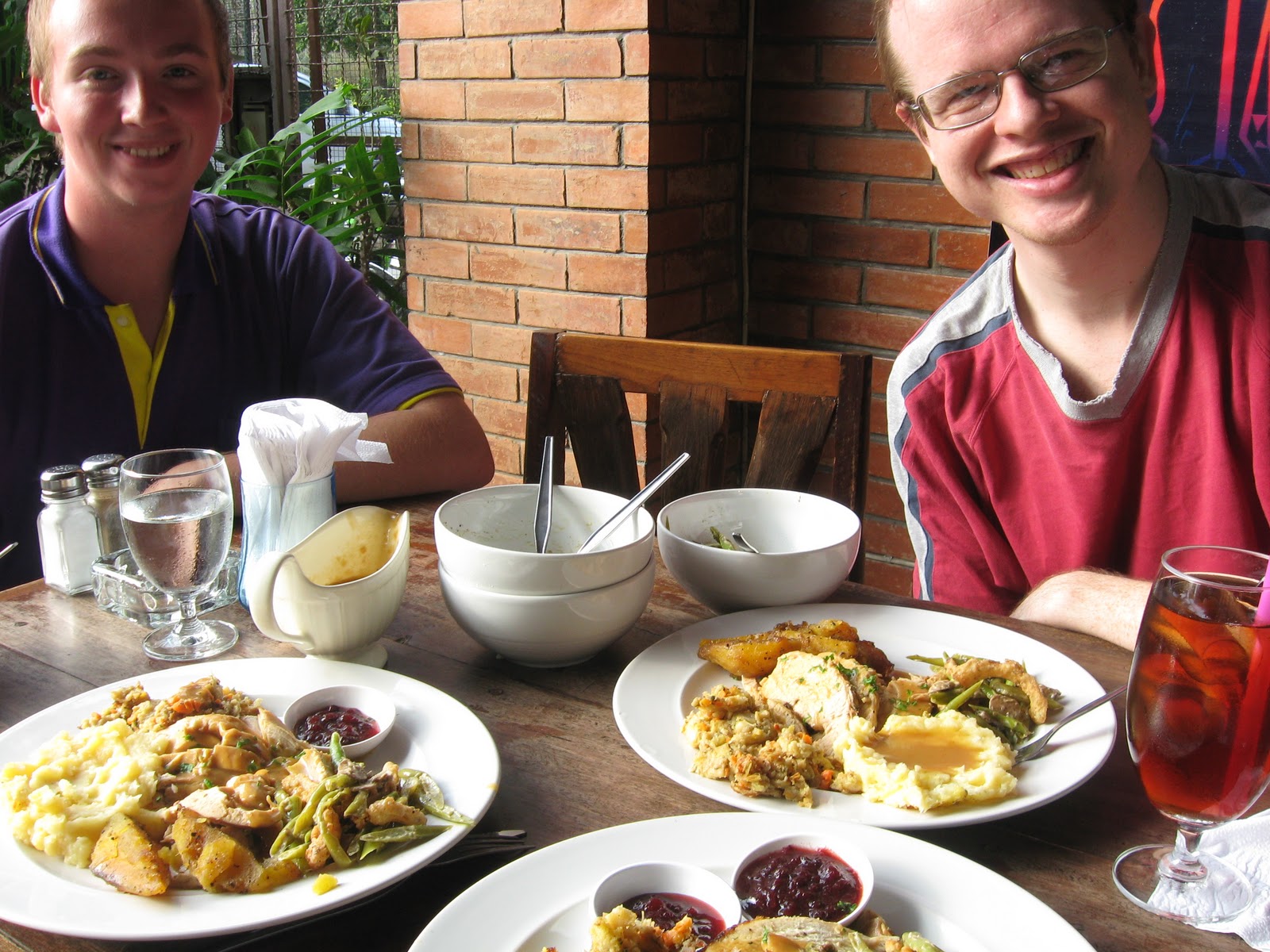 >Living overseas can be a little difficult sometimes. Mostly, it is exciting and fun, but when events or holidays happen at home, it can be a little trying. Fortunately for me, I live near a city big enough to cater to whims of foreigners such as myself. This year for Thanksgiving we went to The Duke’s – a popular foreigner spot (and therefore not a lot of “Thai style” like in my misleading post title). Every year, actually, they have Thanksgiving dinner. It’s a really nice spread that tastes close to home – as close as it possibly can I think. We had butternut squash soup, rolls, caesar salad, and then turkey with all the trimmings – stuffing, sweet potatoes, green beans, mashed potatoes, gravy, and a small dish of cranberries. After that we had a choice of apple or pumpkin pie and a cup of coffee. By the end I was pleasantly full – not stuffed – but I did still feel the afternoon effects of the turkey.
