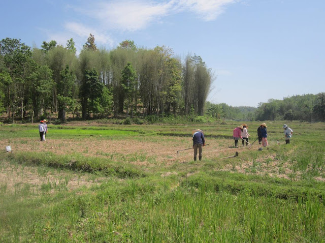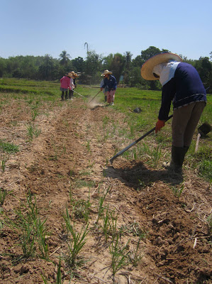 What does Jet Rye mean anyway? Well, it is the latest endeavor of our sustainable agriculture plan; Jet meaning 7 and Rye is a plot of land which equals about 2/5 of an acre. This plot of land, located about 30 minutes northwest of Legacy, we have reserved for the staple food items like rice, corn, soybeans, and peanuts mainly because it is the largest plot we have to work with. Graciously a friend of the school has let us use his land because he cannot farm it at the present time. With the help of a tiller to break the ground the students started planting soybeans last year to replace the nutrients, mainly nitrogen from the rice depleting the soil year after year. Rice left from past plantings also came up and covered the land with a green blanket and proves to be a current rival for any crops we have planted. Thankfully we have been able to raise some rice and soybeans without too much effort. Our latest planting was done on May 2 where we planted corn and peanuts together in 4 large plots. Corn depletes the soil of nitrogen and peanuts enrich it with nitrogen, so we planted the seeds in an alternating fashion. This sense of balance can be found in nature and we are employing this way of planting in our other 2 garden plots back at the Legacy school’s farm as well by planting crops together or rotating them. Because Thailand is close to the equator, it does get extremely warm during the hot season and the students and I took plenty of breaks for water, lunch, and snacks. Hopefully in several weeks we will be able to see the corn and peanuts coming up because of the wonderful rain we have been receiving this week!