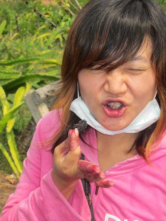 Enjoying the nameless fruit grown on a tree at the school. It is very sweet and jelly like inside. So far my favorite! |