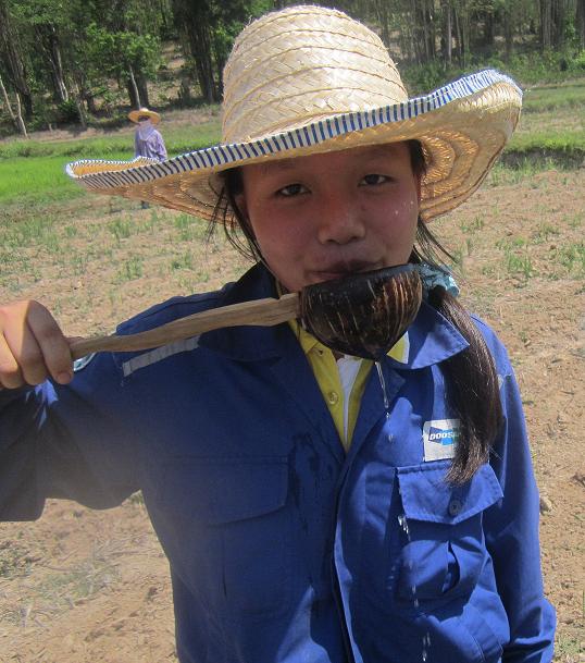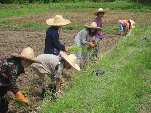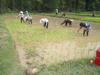 Who knew a little grain of rice took so much time and effort to produce! It is a small grain that is fairly inexpensive and unobtrusive but a staple food in most Asian countries. In late May at Jet Rye (3-1/2 acres), 30 minutes north of the school, we planted rice the Thai style or the wet patty process. As you will see below a full days work of tilling the ground, flooding the patties, pulling rice seedlings, and finally transplanting the rice plants in the two patties takes quite a bit of effort. Plus that is only half of the process! Several months from now when we harvest the rice we will yield about 300 kg. of rice from the each of the patties we planted. The school uses more than four times that much during the year so eventually we hope to produce enough rice for the entire year so we will not have to buy any at the market. Just one of the ways we are trying to move toward a self sustainable farm at Legacy. Check back in in a couple months to see how we harvest and process the rice for food.